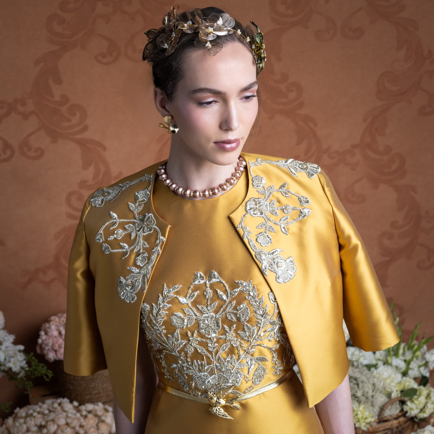 This season, Acra conjures a fantasy of gardens around the globe. Hand-painted petals bloom across Mikado, pastel ferns unfurl over feather-light tweed, lush English bouquets spill over a sunlit yellow gown, while rich brocades echo roses in full bloom. A collage print on travel ready cotton poplin nods to the serene gardens of Japan, evoking their quiet majesty.
