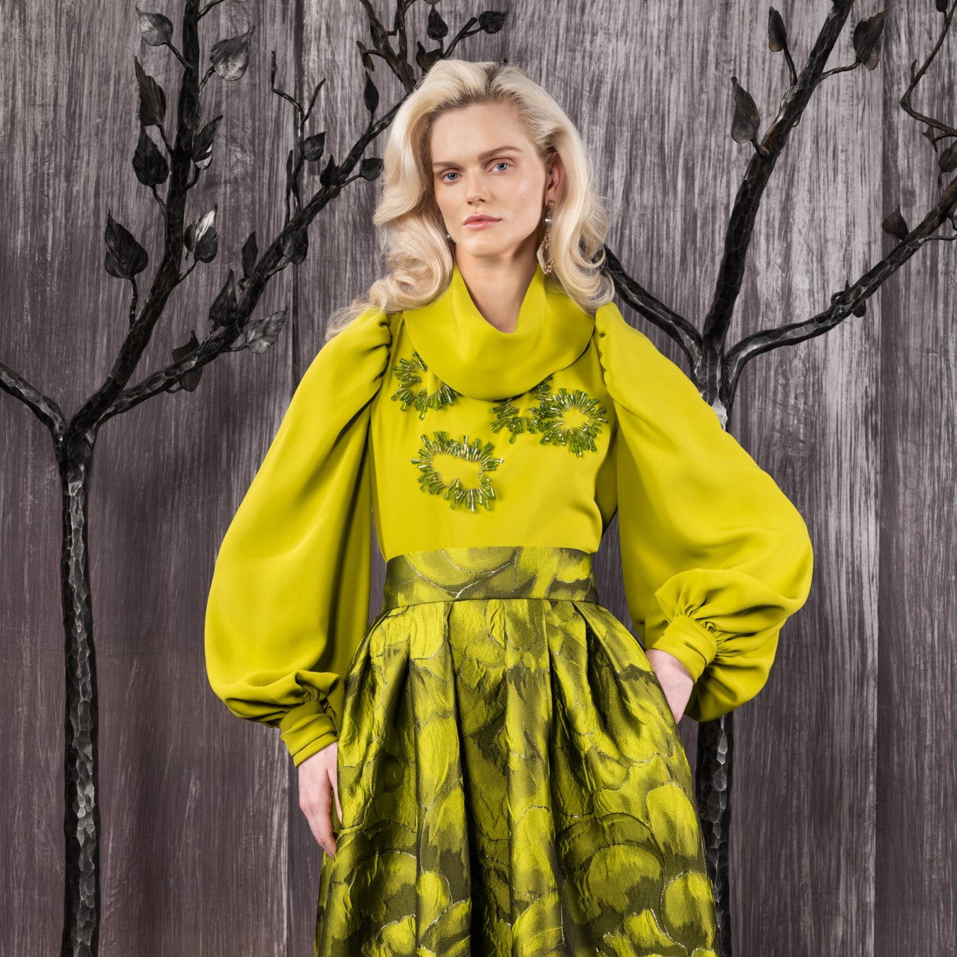 a tour de force of movement, texture, and radiance. 3-D textured brocades with botanical metallic threads, sculpted foliage in tweed and jacquard, organic geo embroideries sprinkled separately or clustered in a column, and hand-sewn velvet petals creating a stained-glass window effect on a gown. Daring yet delicate, this collection captures the spirit of modern couture with effortless