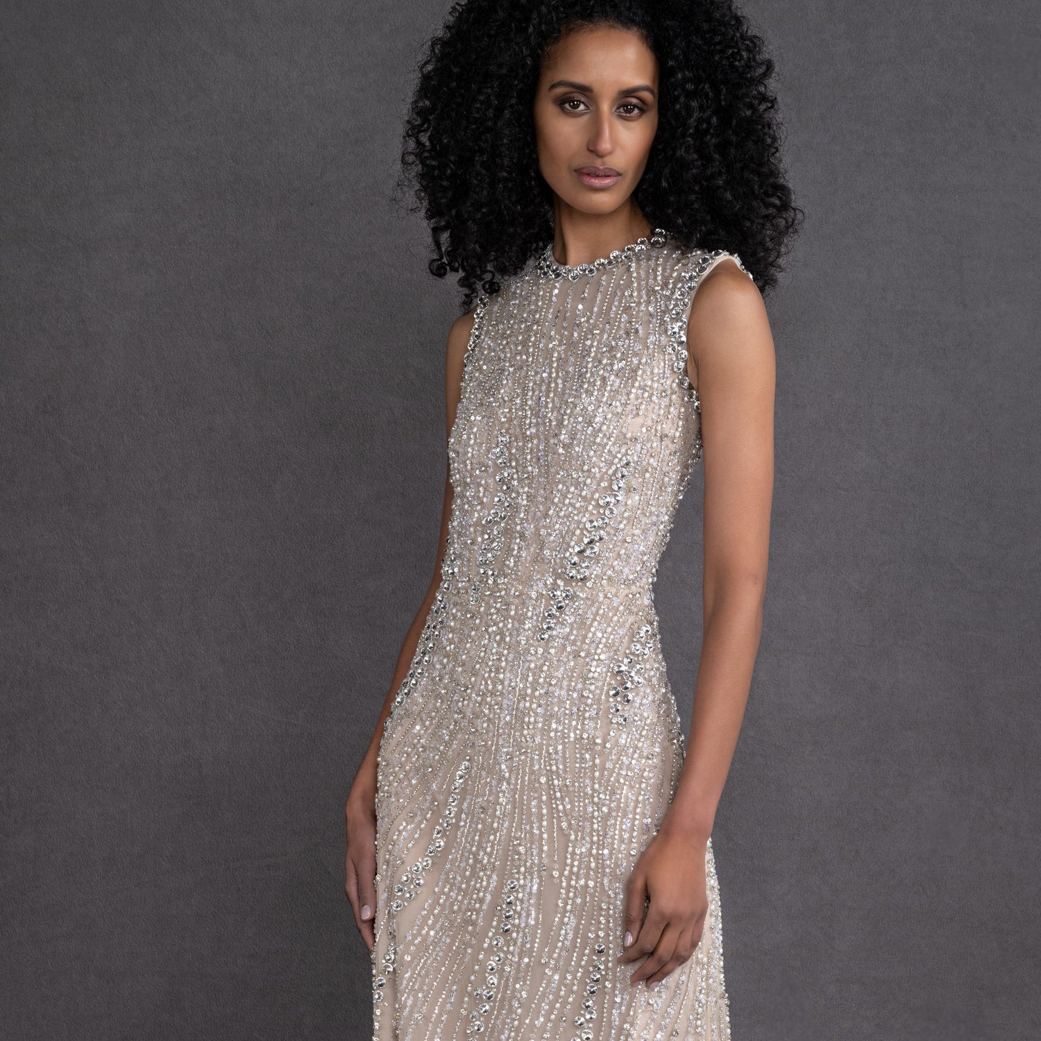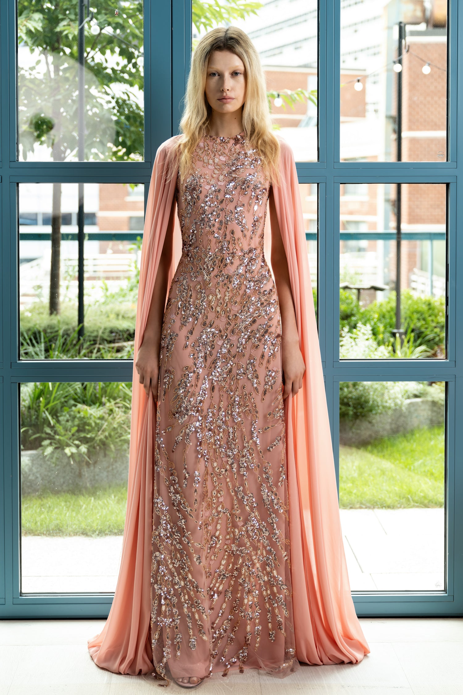Reem Acra’s Pre-Fall 2025 collection, inspired by the desert rose, draws from the designer’s recent trip to the Middle East, where the stark beauty of the desert landscape and its resilient flora left an indelible mark on the designer. The desert rose symbolizes resilience, grace, and quiet strength. Rich textures, such as lacquered jacquards, embroidered tulle, and metallic threads, bring a modern interpretation of the desert rose’s fragile beauty. The intricate hand beading on one gown evokes the shifting sands of the desert’s ethereal landscape. Draped silhouettes and gathered sleeves and skirts mirror the soft petals of the flower. Celebrating women who, like the desert rose, thrive in challenging environments, the collection embodies timeless femininity, capturing the interplay of light and shadow that defines the Reem Acra woman.