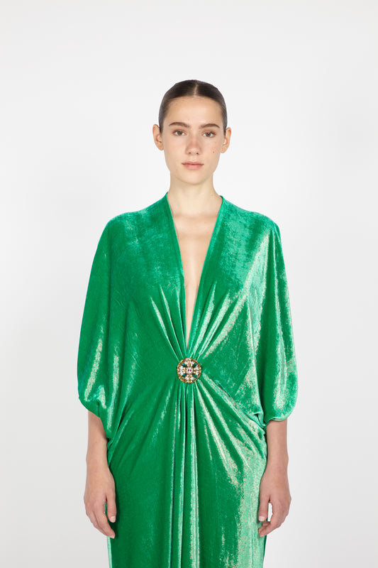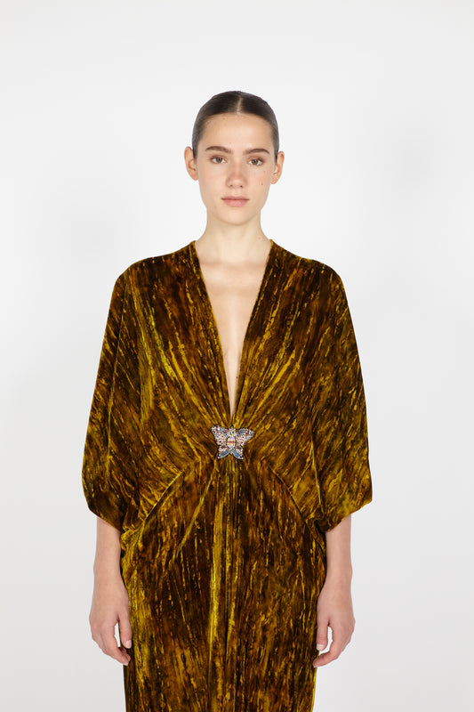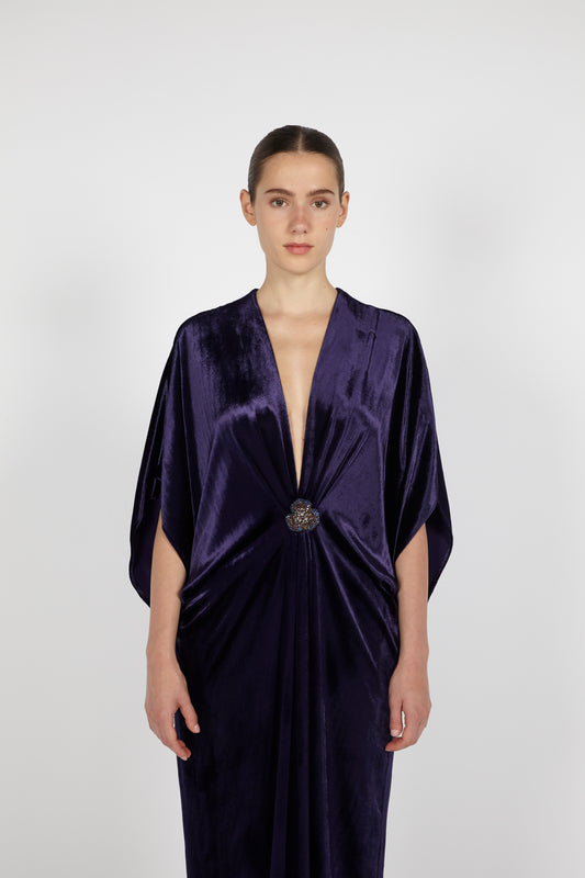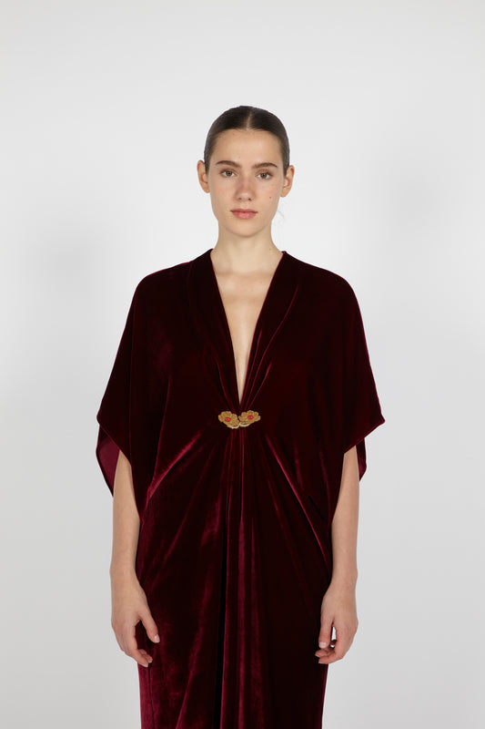 V-NECK MIDI VELVET KAFTAN W/ EMBROIDERED DETAIL