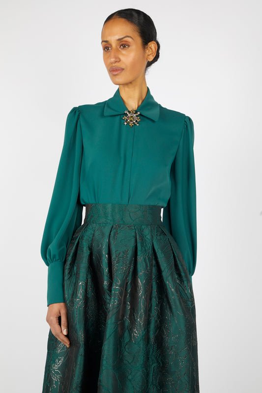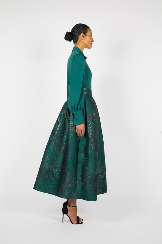CLOQUE BROCADE PLEATED A-LINE SKIRT WITH POCKETS