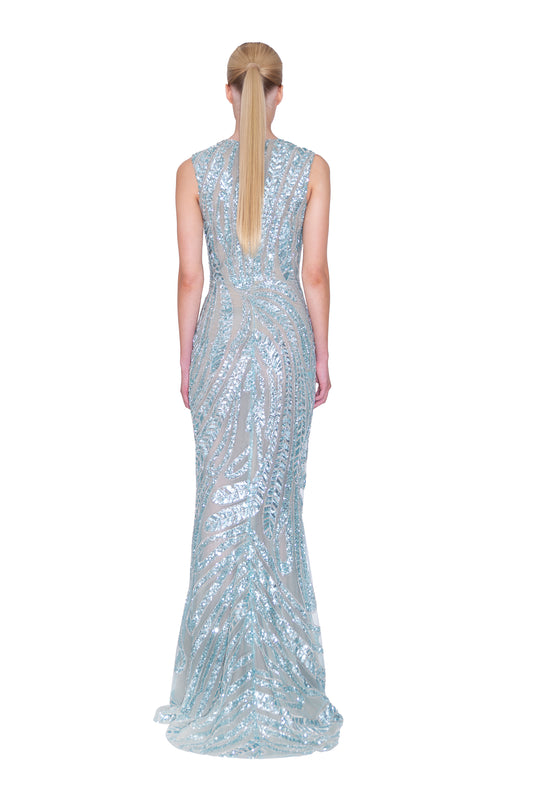 SLEEVELESS SEQUIN AND BEAD EMBROIDERED TULLE GOWN (PRE-ORDER 8 WEEKS DELIVERY)