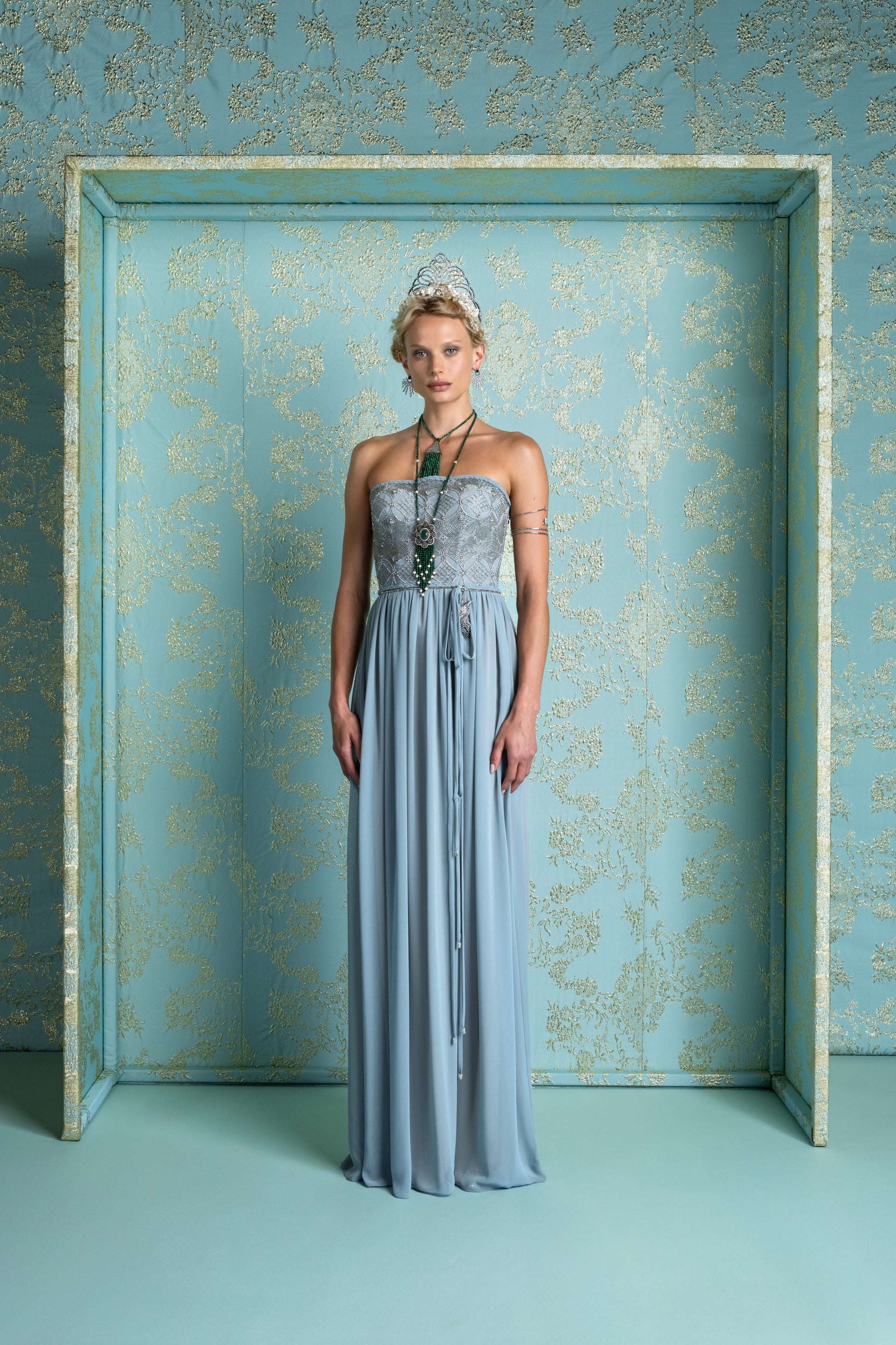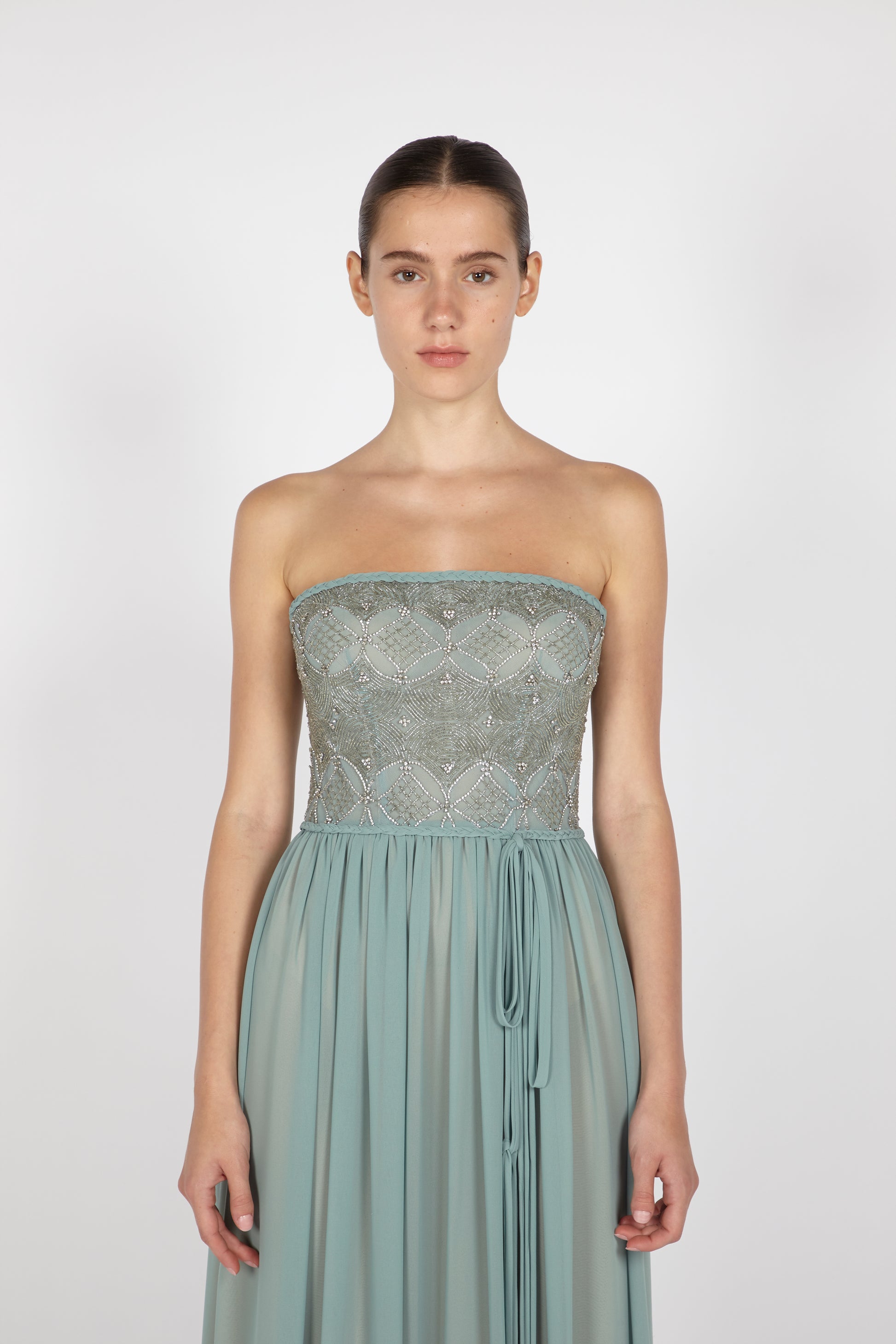 CHIFFON GOWN WITH EMBROIDERED BODICE