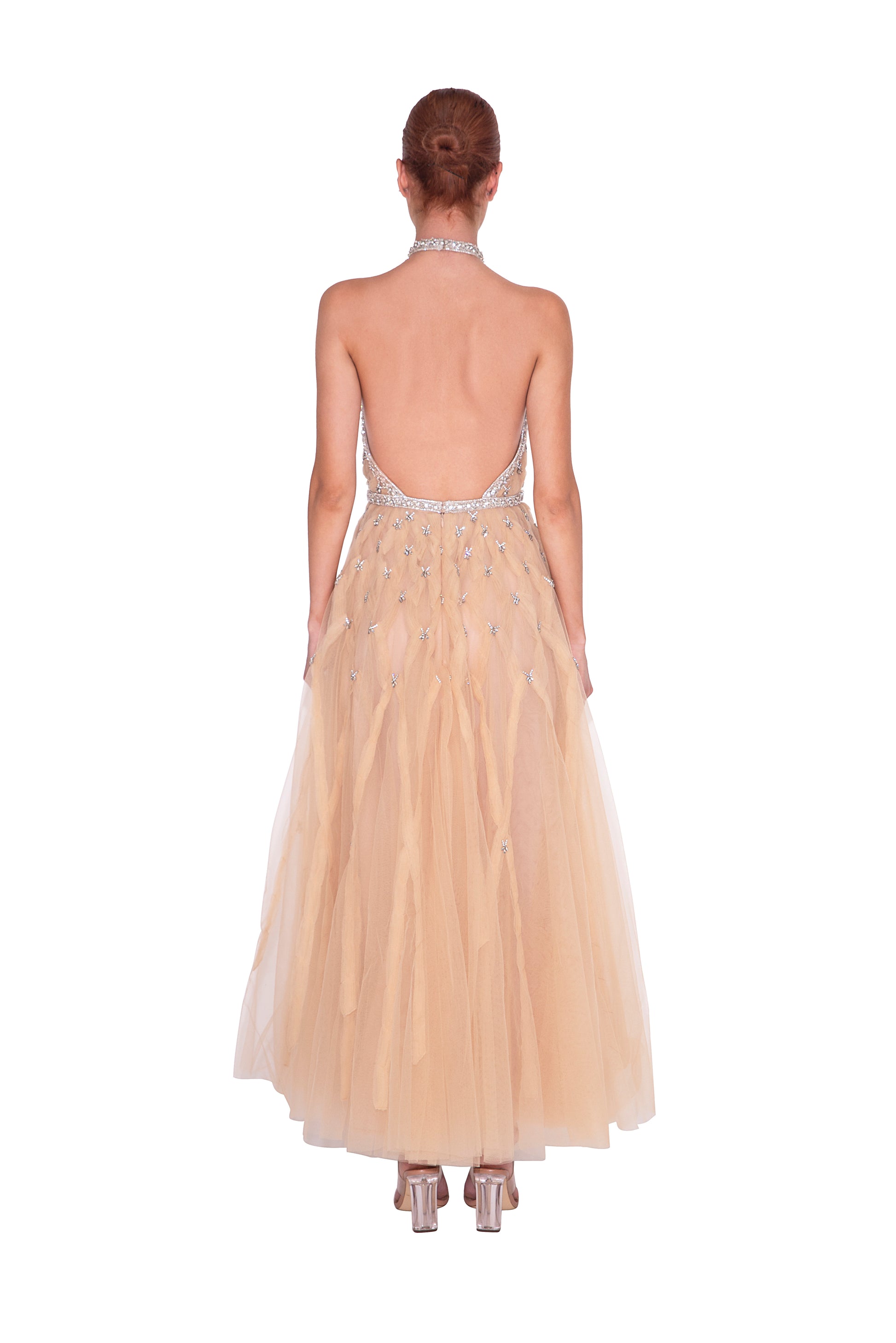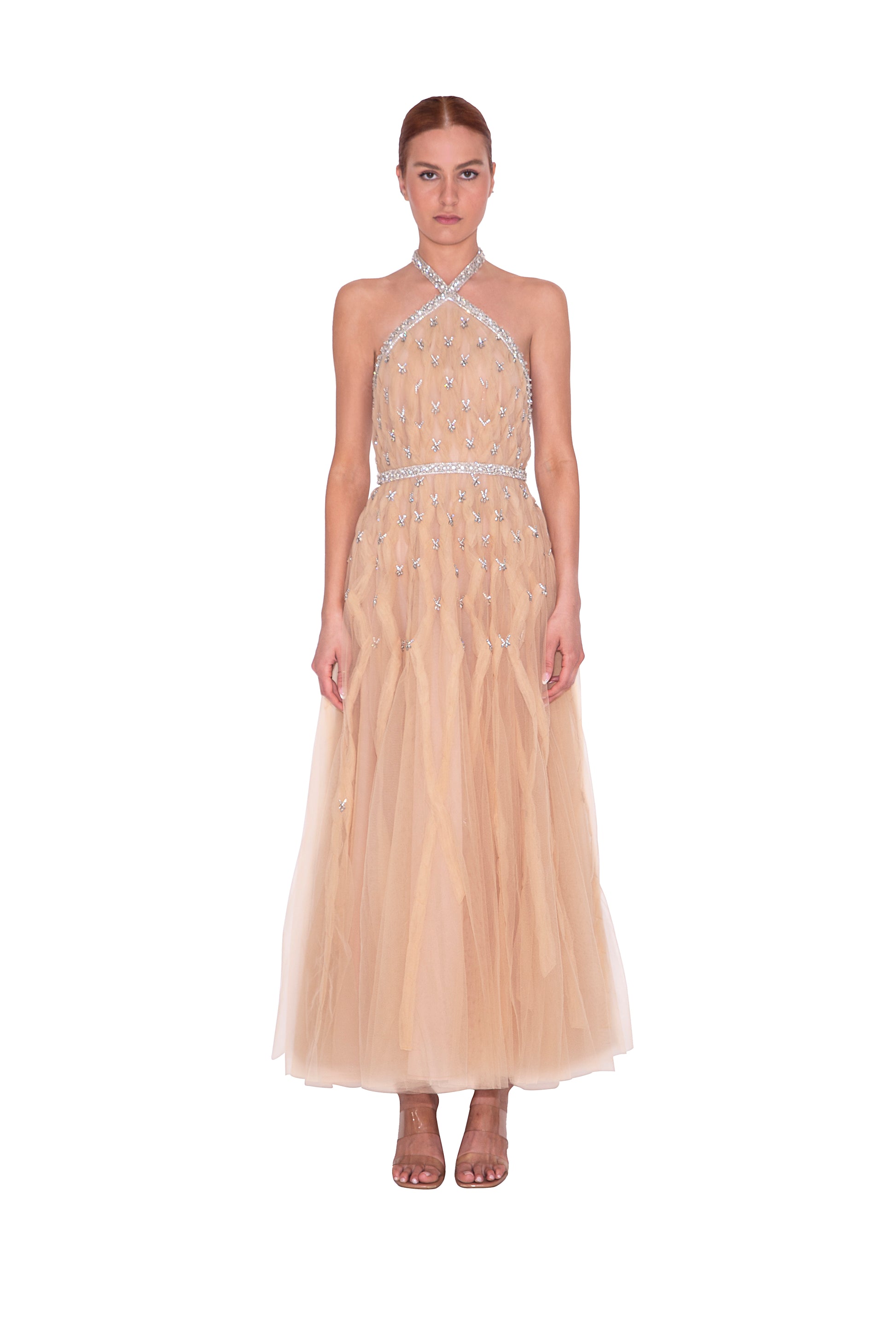 HALTER NECK TULLE MIDI GOWN W/ BEADED DETAIL