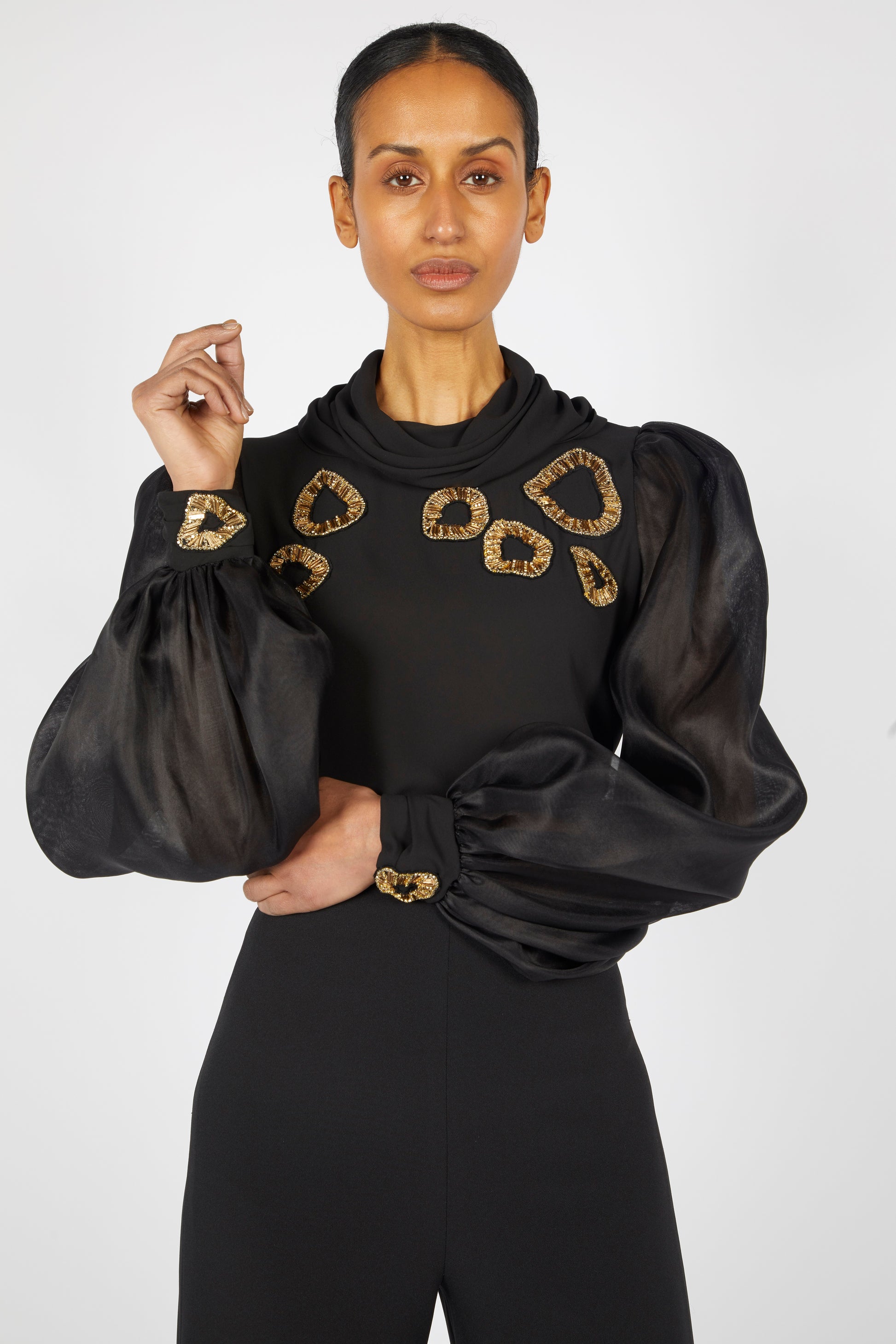 CREPE COWL NECK BLOUSE WITH EMBROIDERED BODICE DETAIL