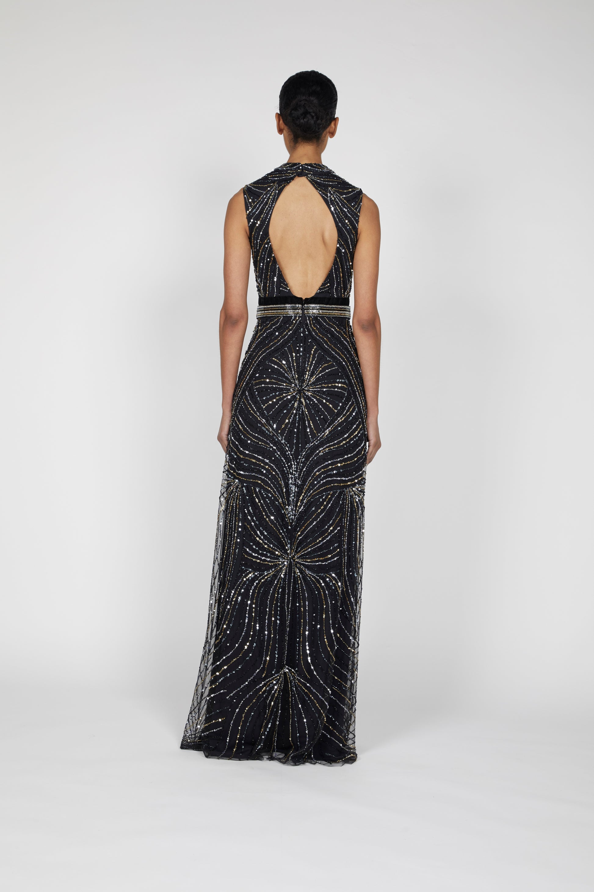 EMBROIDERED GOWN WITH WAIST DETAIL AND KEYHOLE BACK